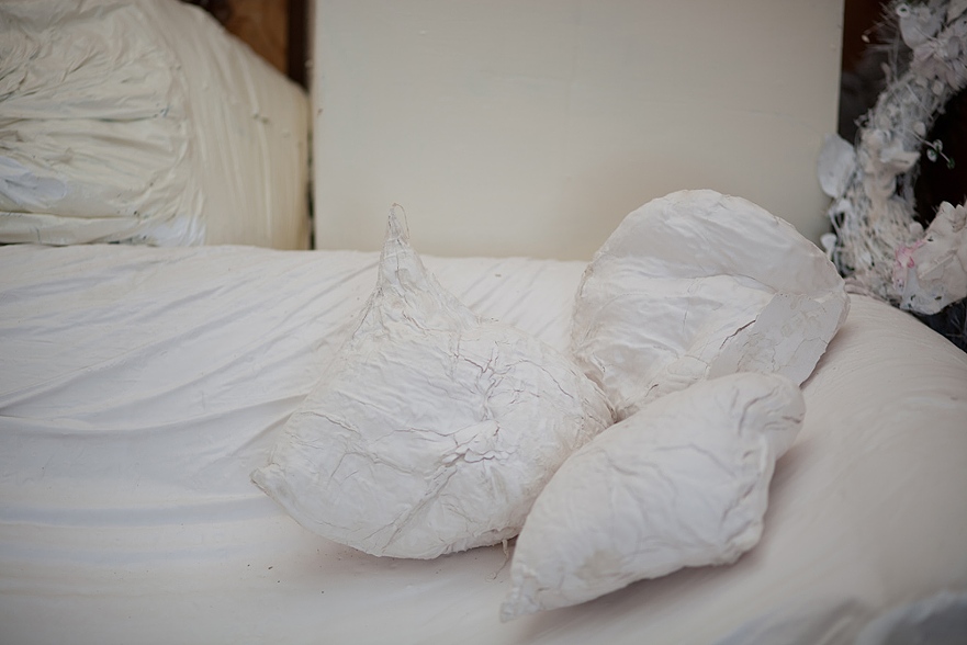This piece explores the notion of storage. As Americans, we are granted the luxury of having space. With this space comes a sense of freedom to collect objects, often beyond the capacity of being able to house all of them, either physically or emotionally. We feel the need to keep the excess objects; perhaps it is comforting to have extra belongings. Maybe they carry a sentimental value but are no longer useful or practical. Maybe the objects are stored temporarily in a time of transition. The objects in this installation are ghostly remnants, decayed and mutated things that are no longer useful. In a consumer-based society, one must deal with physical possessions daily and rationalize their relationship to these objects. This piece explores our relationship to objects that are no longer physically in our lives and how they decay, in our memories and in space.