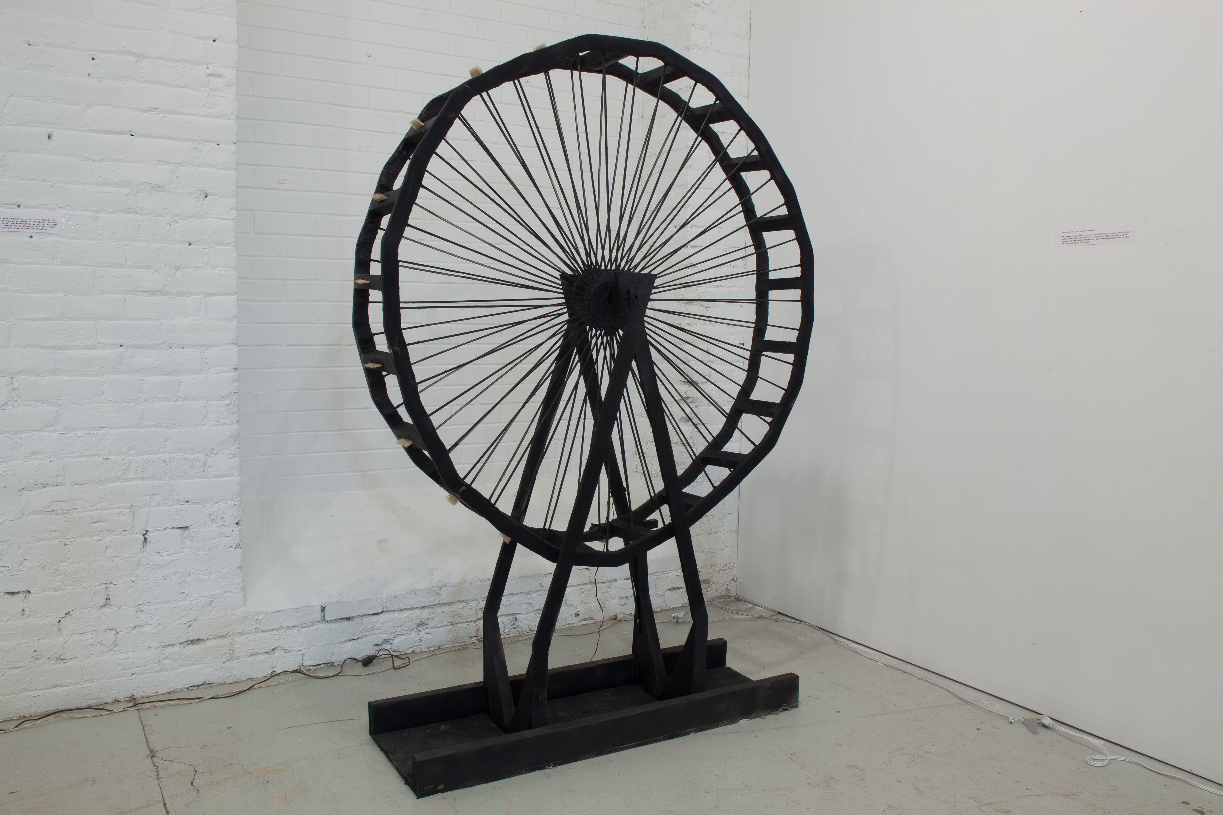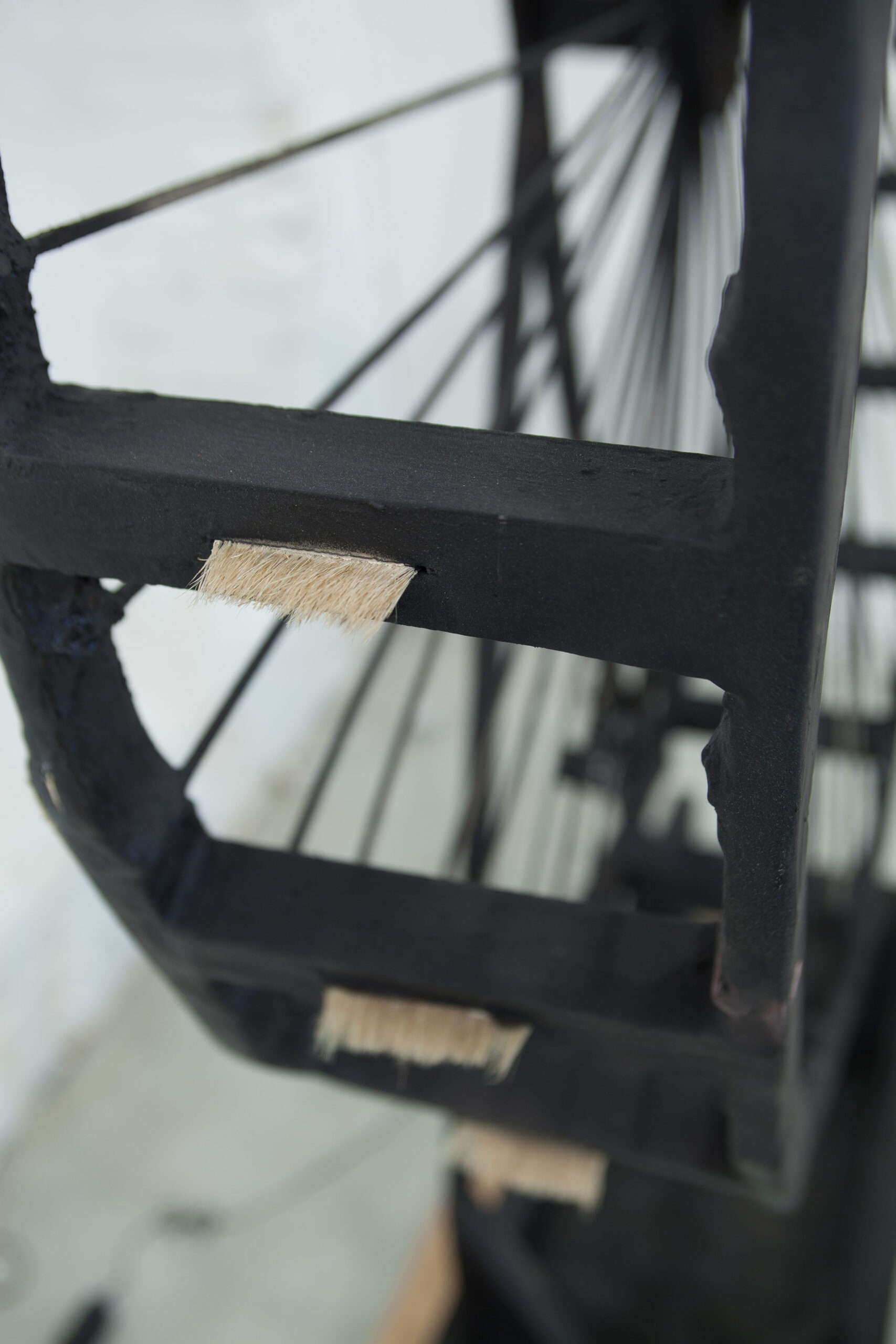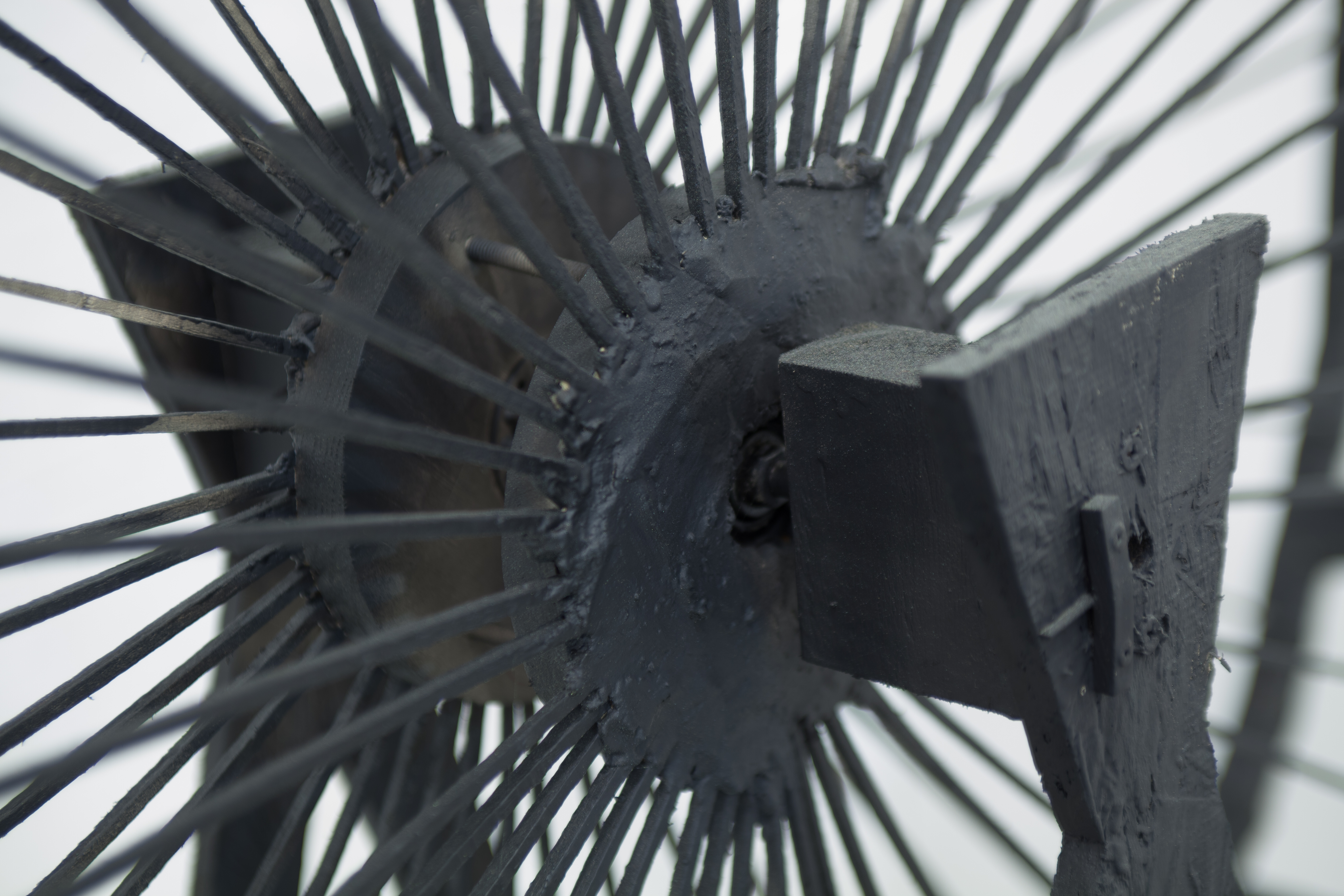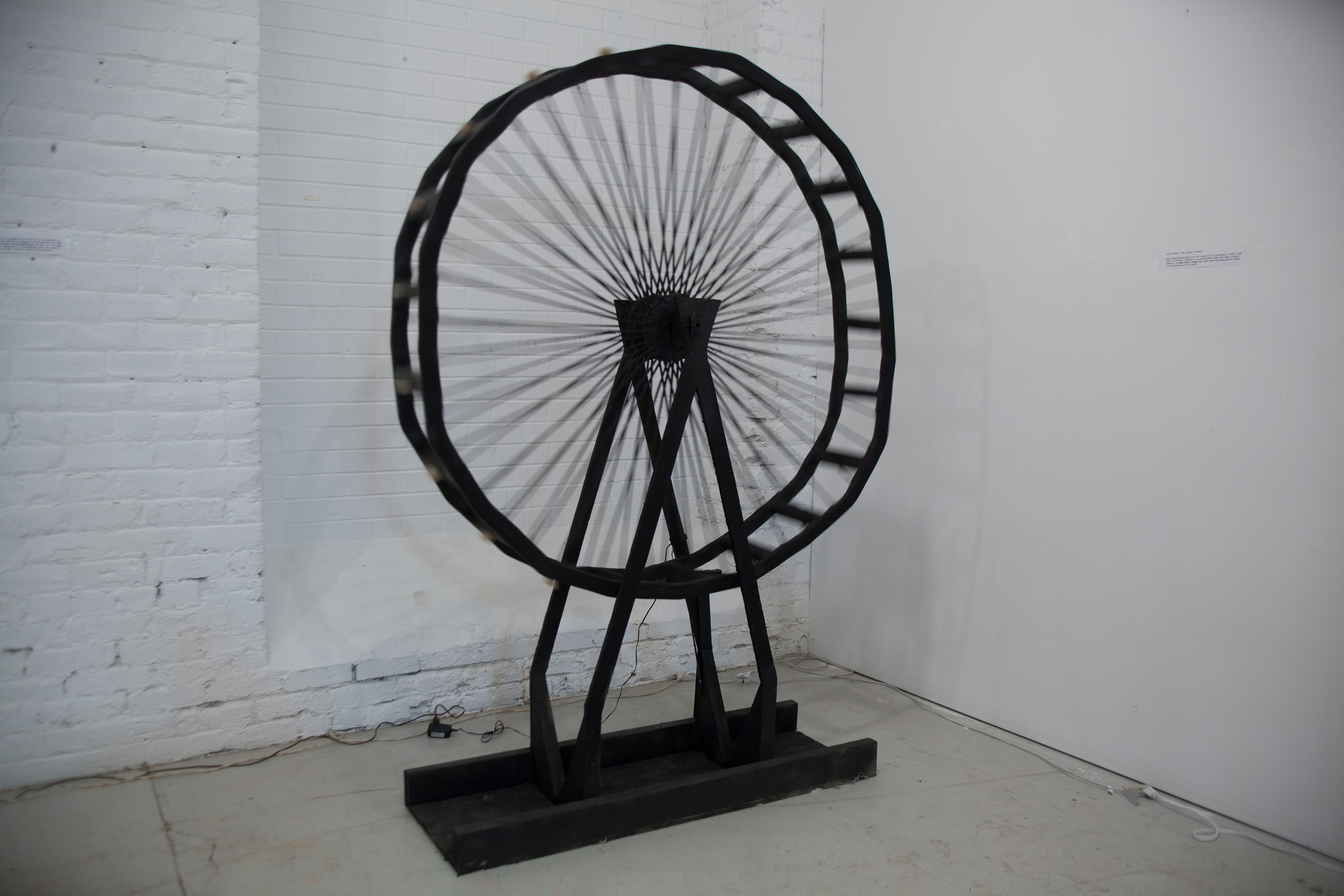 A kinetic wheel that spins at a slow but noticeable pace. Sandwiched between the cross pieces of the wheel are the tan bristles of a paintbrush, painting an invisible line in the air.