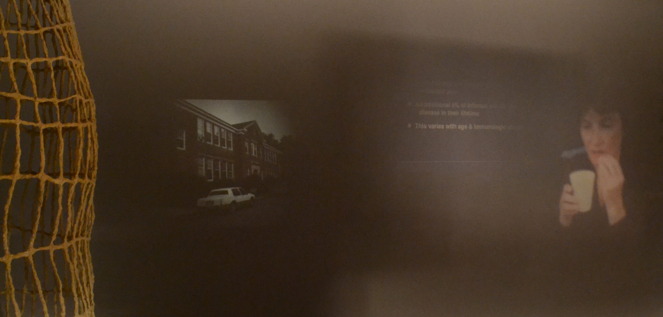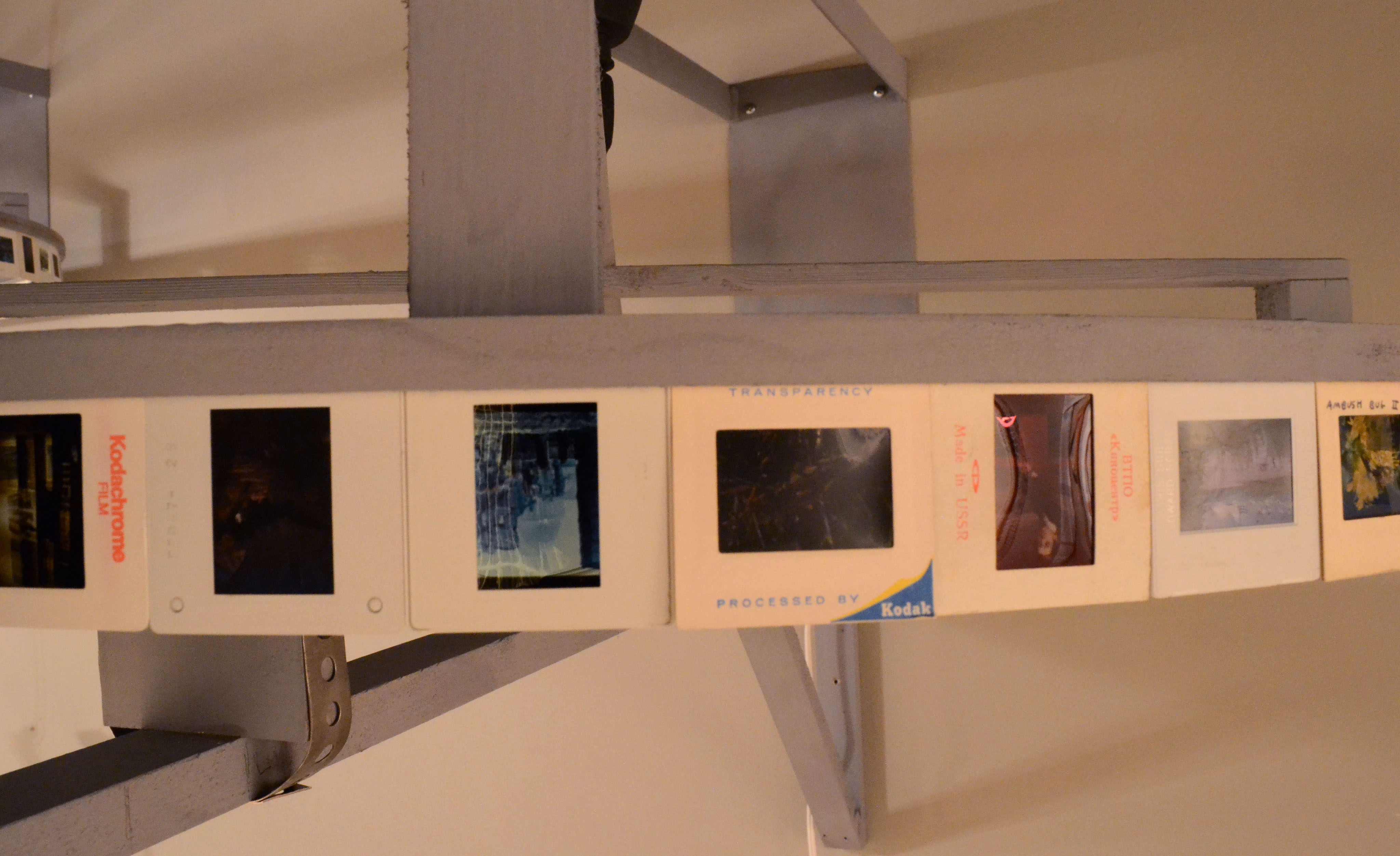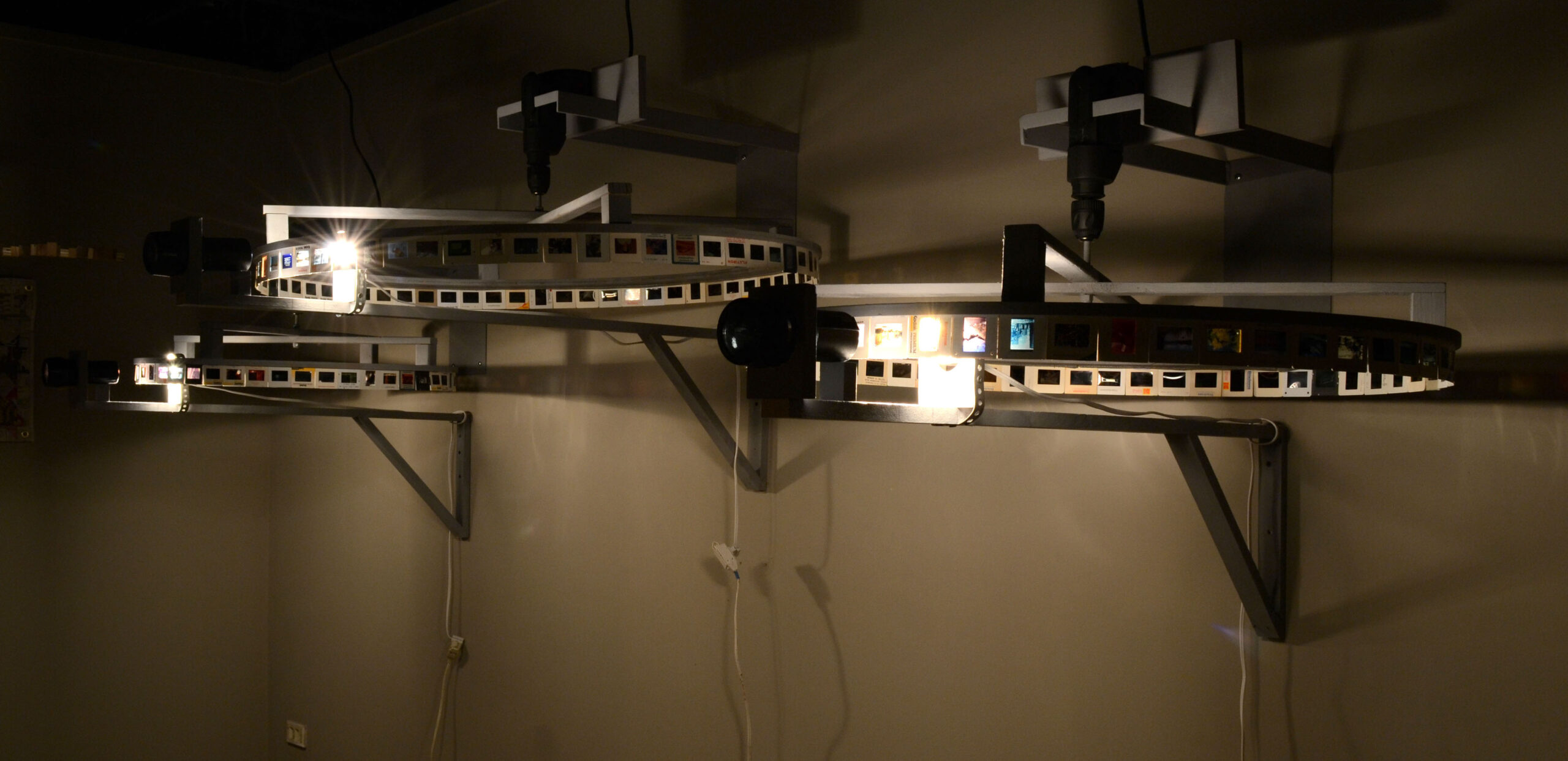 Three mounted slide projectors spin slowly and project distorted images onto an opposing wall. The circular slide holders carry a variety of images including humans, text, architectural spaces, nature and more. The wide array of slides constructs a space for nostalgia (both for lost technology and past experience) and curiosity. The repetitive action, as well as a slight buzz from the motors of the slowed-down drills adds a meditative yet ominous feel to the installation.